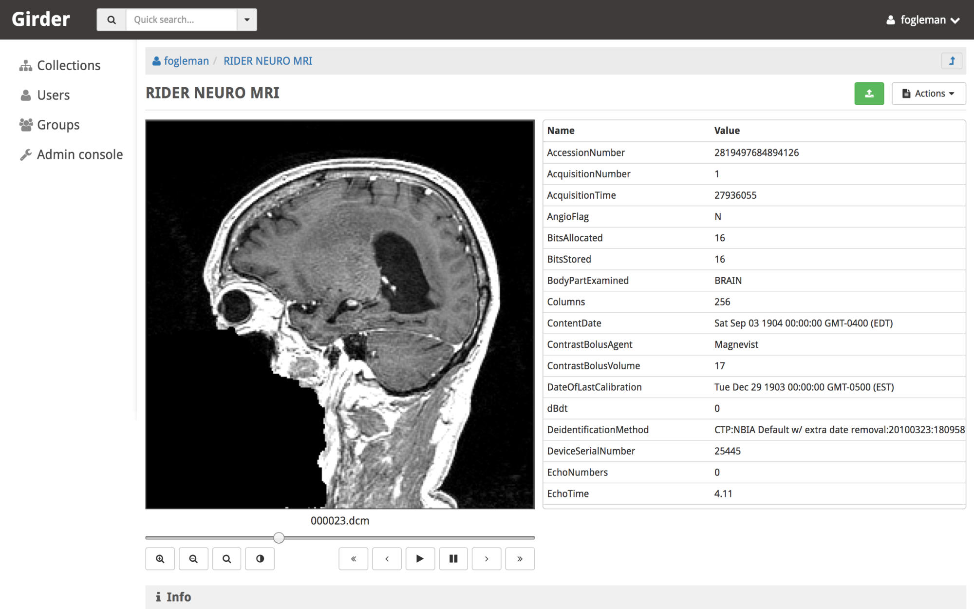 A representative example is Girder, an open-source data management platform designed for scientific workflows. Girder provides a plugin architecture that allows users to integrate custom data-processing pipelines or extend visualization capabilities. For instance, the DICOM plugin to extract slices from DICOM (medical) volumetric datasets and display them along with their associated metadata: