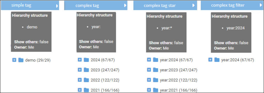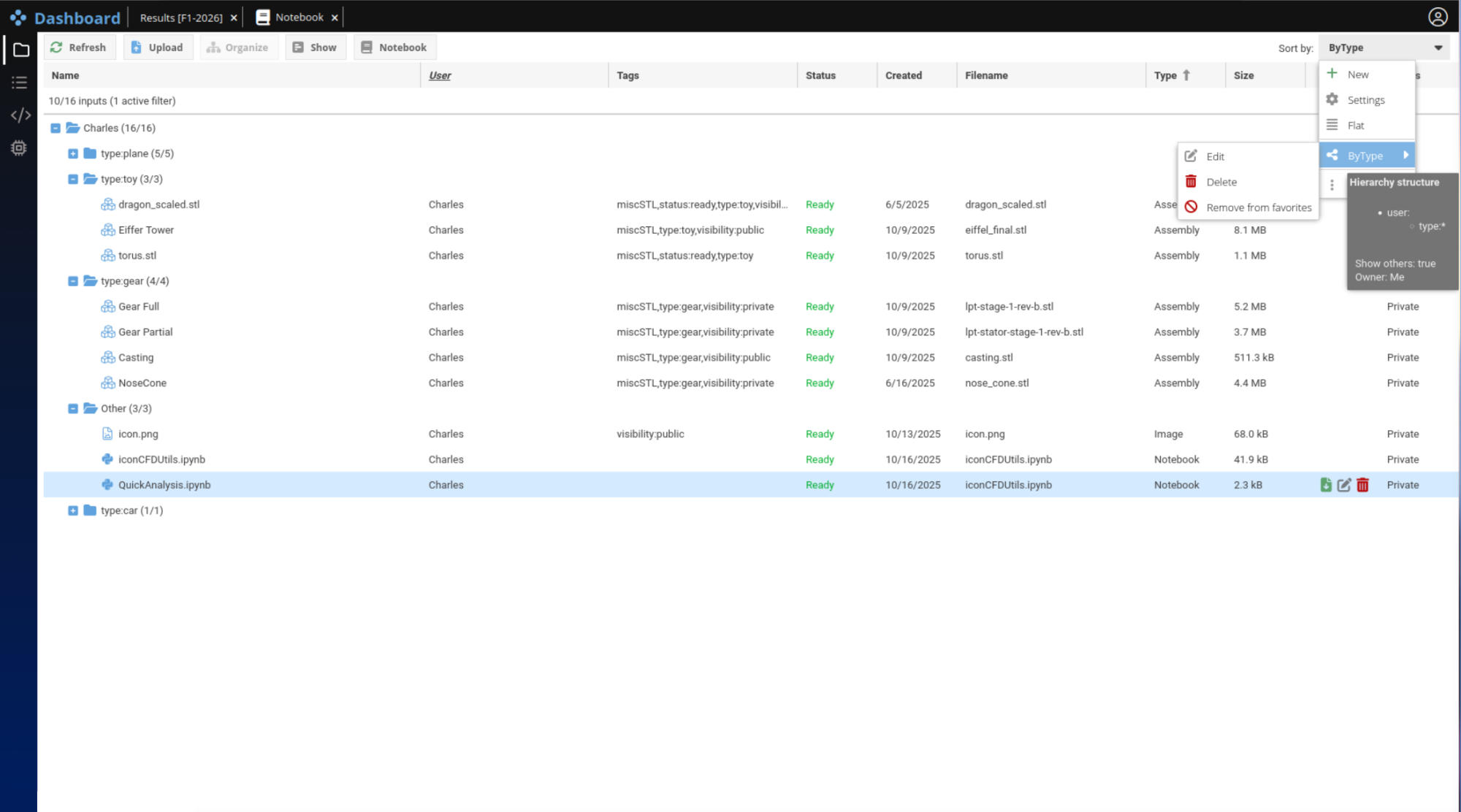 Indeed, unlike traditional hierarchical file systems, the object store identifies data objects independently of their physical location. Our platform takes advantage of this flexibility by using tags to create dynamic, virtual hierarchies. It is thus possible to organize data using various hierarchies, for example User/Type as shown in the previous image. Since these tags are fully user-defined, you can easily design your own navigation schemes, filtering and sorting data to match your workflow and scientific context.