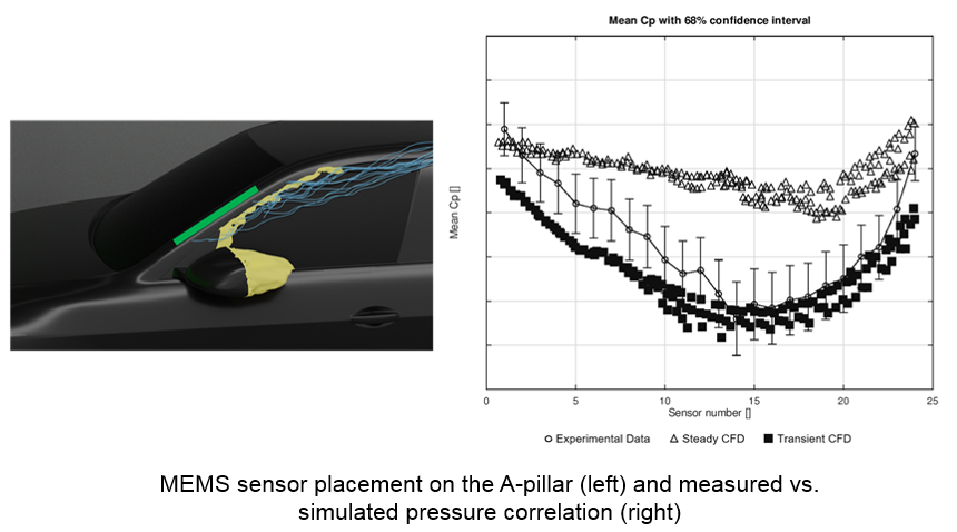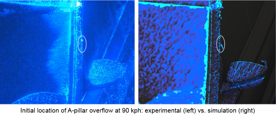 Accurate airflow prediction is essential for capturing the water transport and overflow around the A-pillar. Detached-Eddy Simulation (DES) is more accurate than steady RANS for predicting the unsteady flow structures near the A-pillar, as confirmed by Micro-Electro-Mechanical Systems (MEMS) sensor data.